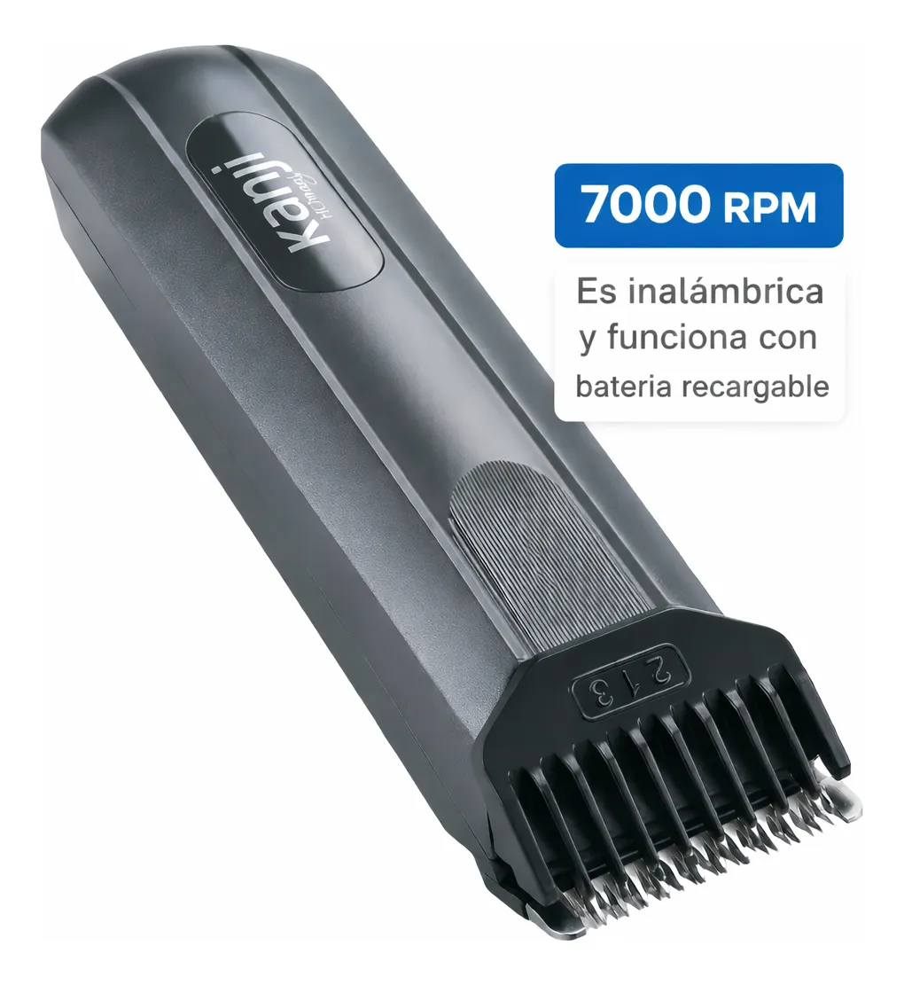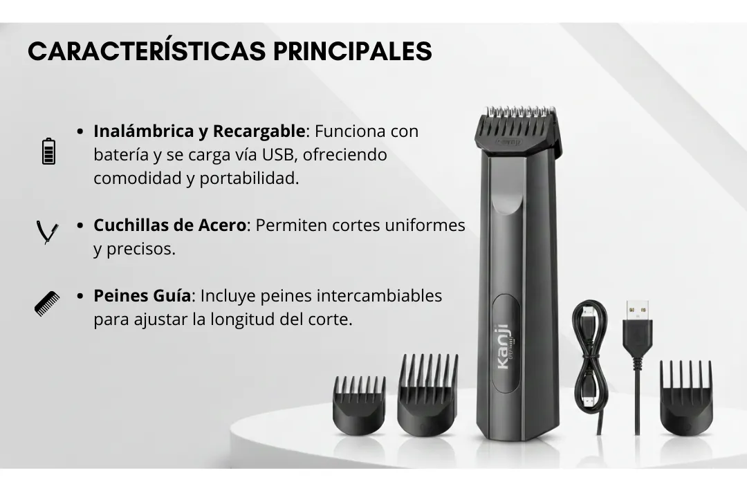 Cuenta con cuchillas de acero inoxidable que garantizan durabilidad y un corte eficiente. Gracias a su batería recargable con carga USB, puede utilizarse de forma inalámbrica, brindando mayor libertad de movimiento y facilidad para cargarla desde notebooks, cargadores o powerbanks.