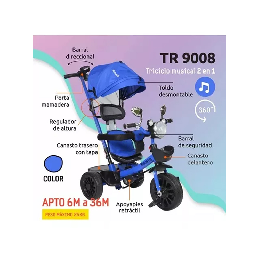 Triciclo Infantil Caño Reforzado BiDireccional Giratorio 360, Caño Reforzado ideal para que el niño aprenda a andar. Estructura metálica. Manubrio para chicos, con canasto Manija para transporte y control de mando. Asientos reistentes. Pedales y apoya pies de plastico. Ruedas de goma.